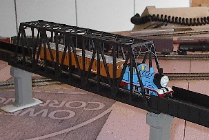top also makes a good place to store extra foam board and small pieces of lumber. The track sits on cork roadbed and is all PECO flextrack with PECO Electrofrog medium turnouts. Past experience showed me that PECO makes an excellent product but this time I improved my turnouts by wiring around the frogs so that the turnout is not dependant on a good connection between the points and the rail. This means that the turnout is much more reliable. All turnouts are controlled from the control panel with PECO switch machines with SPDT switches attached to the bottom of the machine, which controls the frog polarity. The switch machines are powered by a capacitor discharge unit that I purchased for my last layout. There is also a double sissor crossing so that a train can be switched from the outside loop to the inside figure 8, and visa versa, and a set of three Kato bridges to cross the gap from one mountain to the other. |