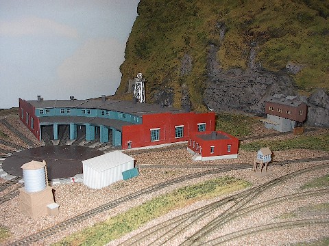 better than I expected. The town is mostly of ceramic houses that I picked up at a clearance sale at Halmark. I did some detail work on them, but for the most part, they are just as they were when I bought them. There is also a warehouse that I built from a kit that fits against one of the sidings. The entire left side of the layout was left for the roundhouse and turntable that I was going to put in later. Later turned out to be 2 years. It started out as a sunken turntable and roundhouse, a cornerstone kit. I installed it, wired it, and tried to get it working, but had a really dificult time getting it indexed. After an entire vacation trying to get it working, I broke down and installed the Atlas roundhouse and turntable. It works flawlessly and after a little detailing, it looks pretty good also. |